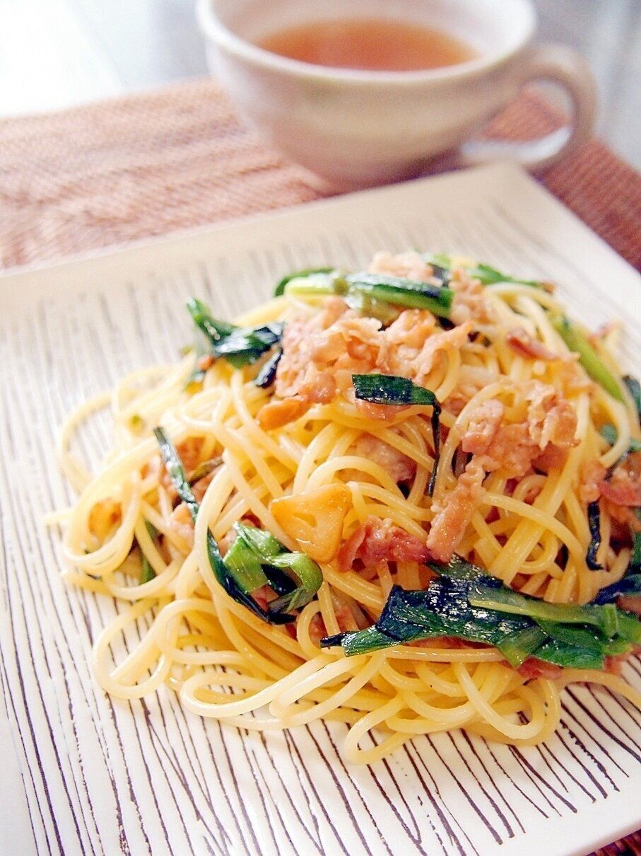 にんにくが効いたペペロンチーノに、ニラをいれて和風に仕上げた一品です。にんにくとニラの香りで、食が進むこと間違いなし!前日のおかずにつくった豚ニラの残りを、このパスタにアレンジするのもいいですね。