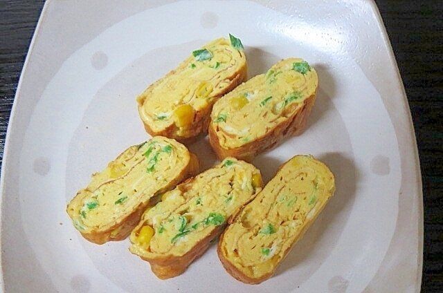 お弁当のおかずの定番、たまご焼き。こちらは、ニラとコーン缶を混ぜてつくるレシピです。おつまみにも最適で、たまご液は少しずつたまご焼き器に注いで、きれいに巻ければ完成です。