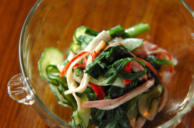 定番のきゅうりとカニ風味カマボコのあえものですが、さらにニラをプラス。味つけは、マヨネーズと練りからしでシンプルに。「もう一品ほしい」というときに役立つレシピです。