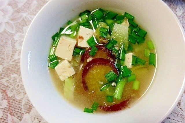 ニラはみそ汁の具材にもよく合います。ニラに豆腐と輪切りにしたさつまいもをごろごろ入れてつくるレシピです。出汁をとったかつお節は、そのまま具材としておいしく食べられますよ。