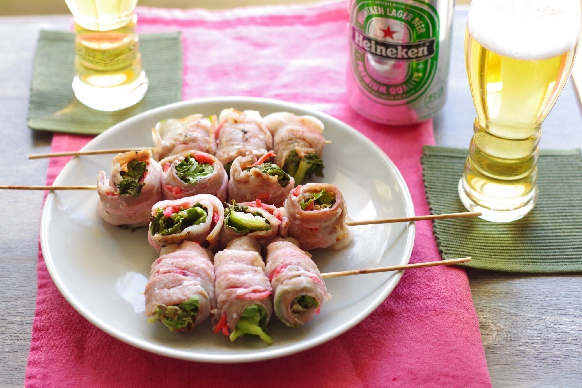 ビールのおつまみにぴったりな、レタスと紅しょうがの肉巻き串。フライパンを使わずに、トースターで焼き上げる楽ちんレシピです。あればリーフレタスを使うと、巻きやすく見た目もきれいになりますよ。