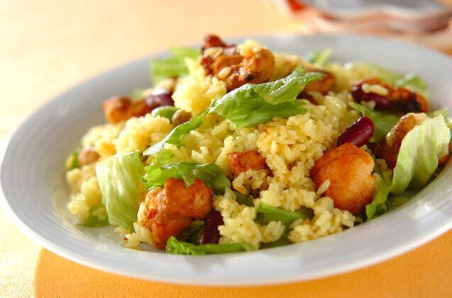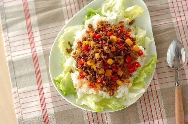 もりもりのレタスと、パプリカの色味も効いたケイジャンライス。レシピによると、「アメリカの郷土料理を簡単にアレンジ」しているそうで、約15分で完成する手軽さもうれしいメニューです。タバスコをかけてピリリとした風味をプラスするのもおすすめです!