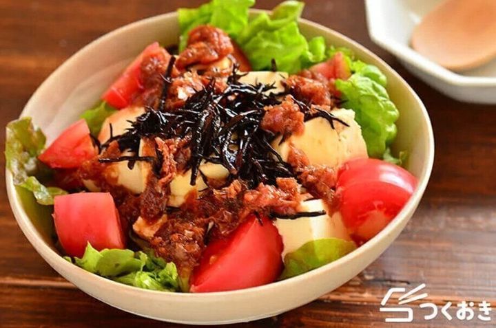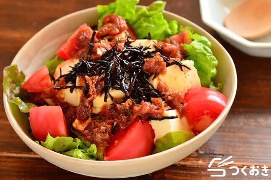 とろっとした木綿豆腐と、トマト、シャキシャキレタスを使ったサラダのレシピ。梅干しやポン酢、おかかの風味でお子さまでも野菜を食べやすく、ヘルシーでおいしい野菜のおかずや、副菜にもってこいのお手軽メニューです。