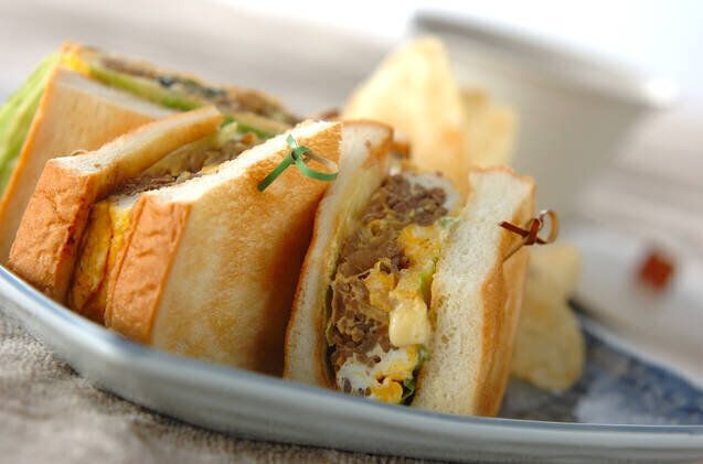 すき焼き風の味つけがポイントの、和風卵とじサンドイッチのレシピ。和と洋のよいところを、どちらも堪能できそうです。白ごまを加えた「ゴママヨネーズ」のコクが、レタスとほか具材をふんわりまとめてくれそうです。