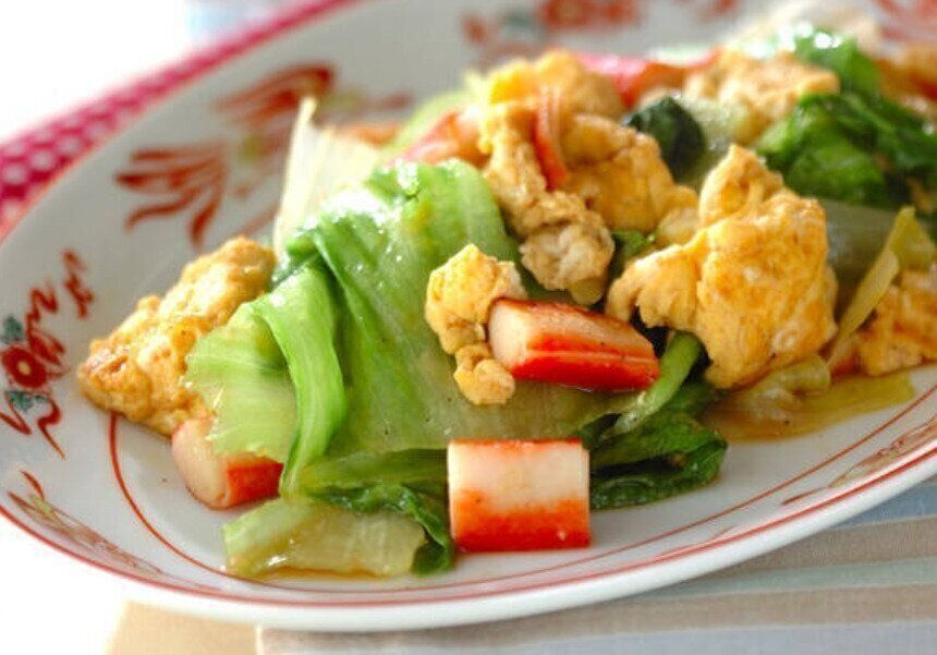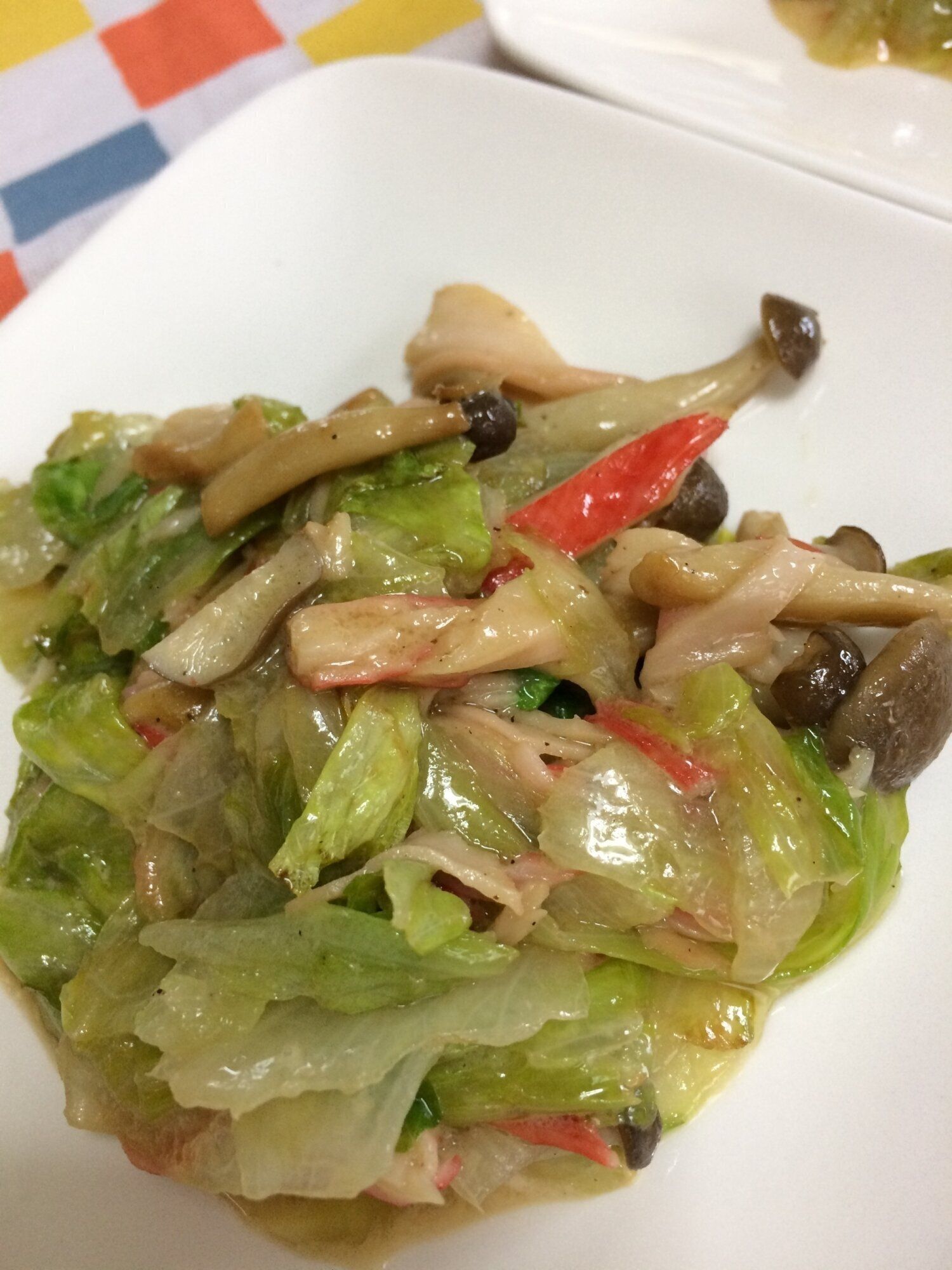 ふわふわの卵と、かに風味かまぼこ、そしてレタスの食感がたまらない、レタスとカニカマのオイスター炒めです。すぐに火が通るので調理もらくらく。オイスターソースで味もしっかり整って、手軽な中華の副菜にぴったりですよ。