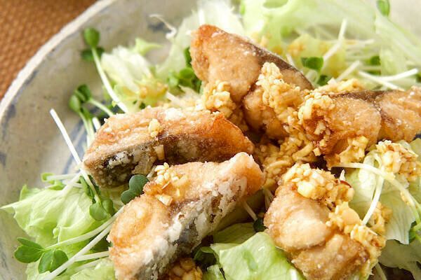 お魚のメイン料理が食べたい時にぴったりの、揚げサバ・ネギソース。ネギやしょうが、レモンの風味も合わさった「ネギソース」でお箸が進みそうです。カラッと揚げたサバのジューシーさが、さっぱりとしたレタスによく合いそうですね!