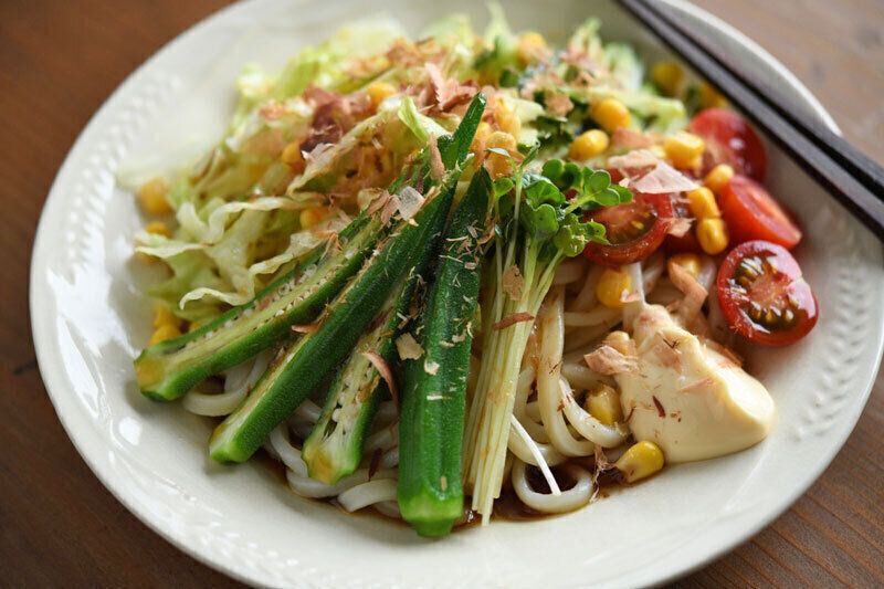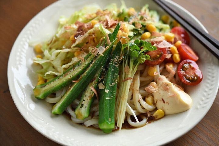 レタスやミニトマトなど、野菜をたっぷりのせたサラダうどんのレシピ。さっぱりして食べやすく、一皿で栄養もしっかりとれます。レタスは細長く切ることで、麺によくからむようになりますよ。
