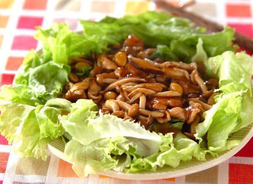 とろりとした旨みたっぷりのきのこあんかけと、シャキシャキレタスのハーモニーがおいしいキノコのあんかけレタスのせ。ギンナンのかわりに水煮大豆を使ってもおいしく食べられますよ。メインのおかずにもおすすめのレシピです。