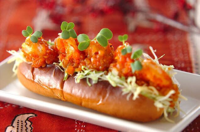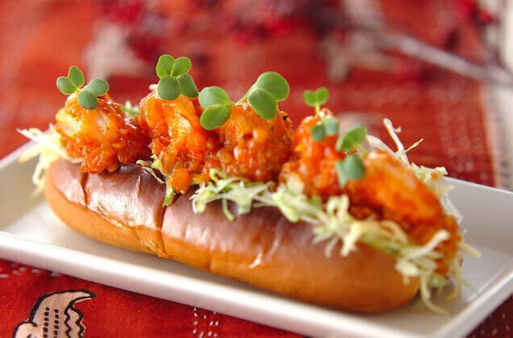 ホットドック用のパンに、レタスやチーズ、エビチリなどをサンドした、彩り豊かなサンドイッチのレシピ。エビチリのリメイクレシピにもぴったりですね。シャキシャキのレタス、プリプリエビの食感のメリハリを楽しめそうです。