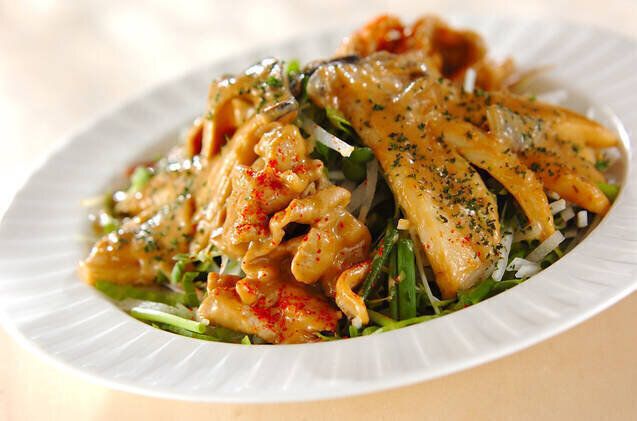「レタスと桜エビのワサビ和え」は、レタスと干し桜エビを合わせてつくるメニュー。どこにドレッシングと練りワサビ、仕上げにのりを添えて完成です。桜エビの風味と、練りワサビのピリ辛具合がクセになりますよ。