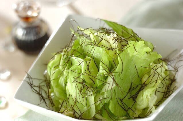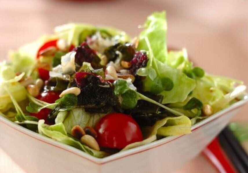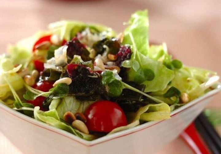 さっぱりシャキシャキとしたレタスと、歯ごたえも楽しめる海藻の組み合わせで、たっぷり食べられるサラダのレシピ。松の実のかわりに、野菜チップスをトッピングしてもおいしいです。洋食の副菜にもおすすめですよ。