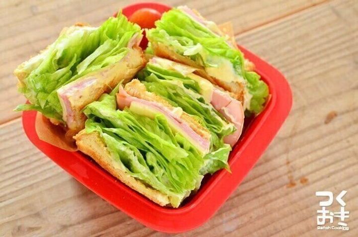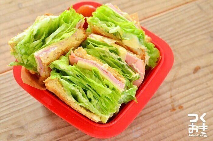 レタス・ハム・チーズをはさんだ、シンプルなサンドイッチ。レタスをできるだけたっぷりと入れることで、見栄えもおいしさもアップします。お弁当箱に詰めてもおしゃれですね。