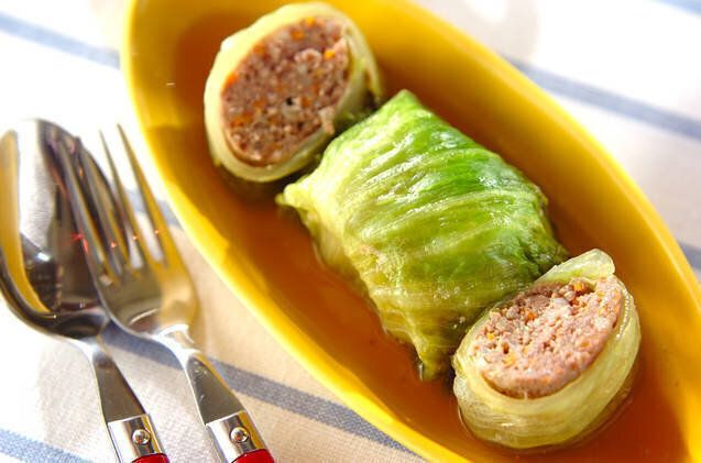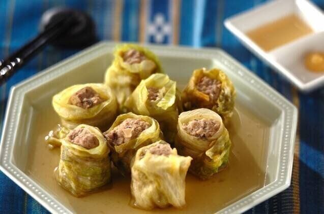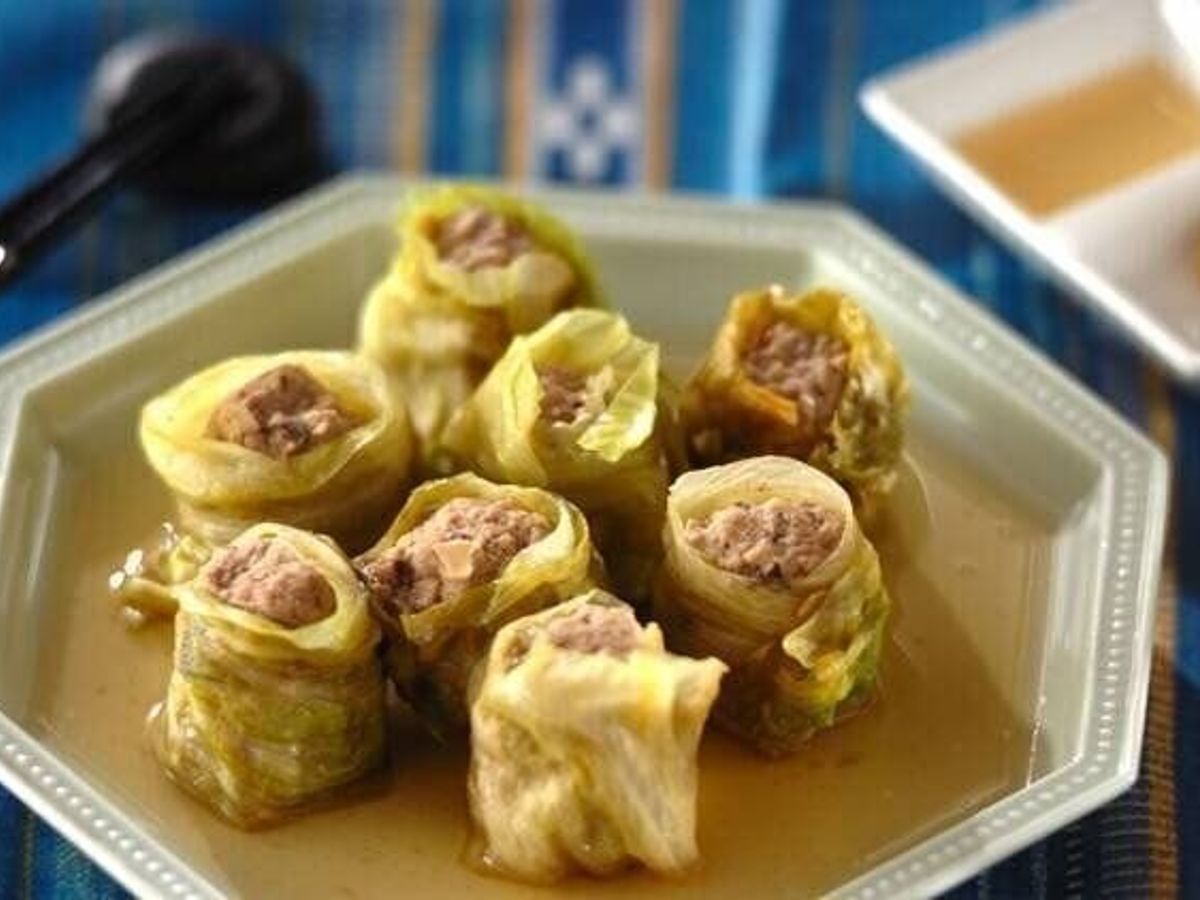 ロールキャベツならぬ、ロールレタスのレシピ。中には牛ひき肉のうま味がぎゅっと詰まっていて、ジューシーな仕上がりです。レタスは火が通りやすいため、煮込み時間も15分と短く済みます。