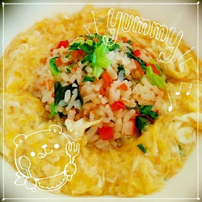 盛りつけがおしゃれなあんかけチャーハンのレシピ。レタスの食感を残したチャーハンと、ふわふわの卵あんかけのハーモニーを楽しめます。レタスの緑、かにかまの赤、卵の黄色のコントラストもきれいですね。