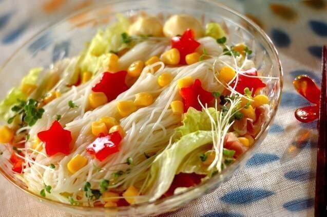さっぱりとしたものを食べたい日におすすめのサラダ素麺です。レタスのほかに、赤パプリカやコーンなどの具材が入った彩りのよい一品。野菜をたくさん食べたい日にもぴったりです。