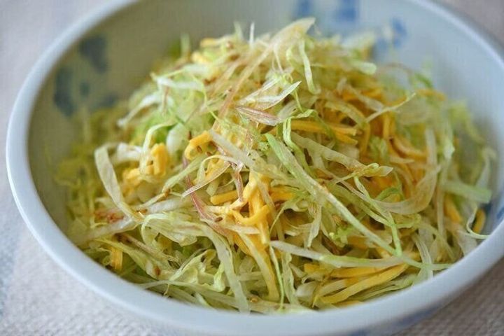 「レタスと玉子のサラダ」は、千切りにしたレタスと錦糸玉子、みょうがを合わせてつくった一品。そこに酢、しょうゆ、砂糖などの調味料を混ぜて完成です。レタスのシャキシャキ感とたまごのふんわり感の相性も抜群ですよ。