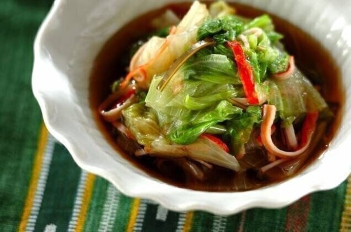 たっぷりのだし汁にレタスを浸した、簡単お浸しレシピ。カニ風味のカマボコを入れて、味と見た目にアクセントをプラス。シャキシャキのレタスを、ひんやりおいしく堪能できます。