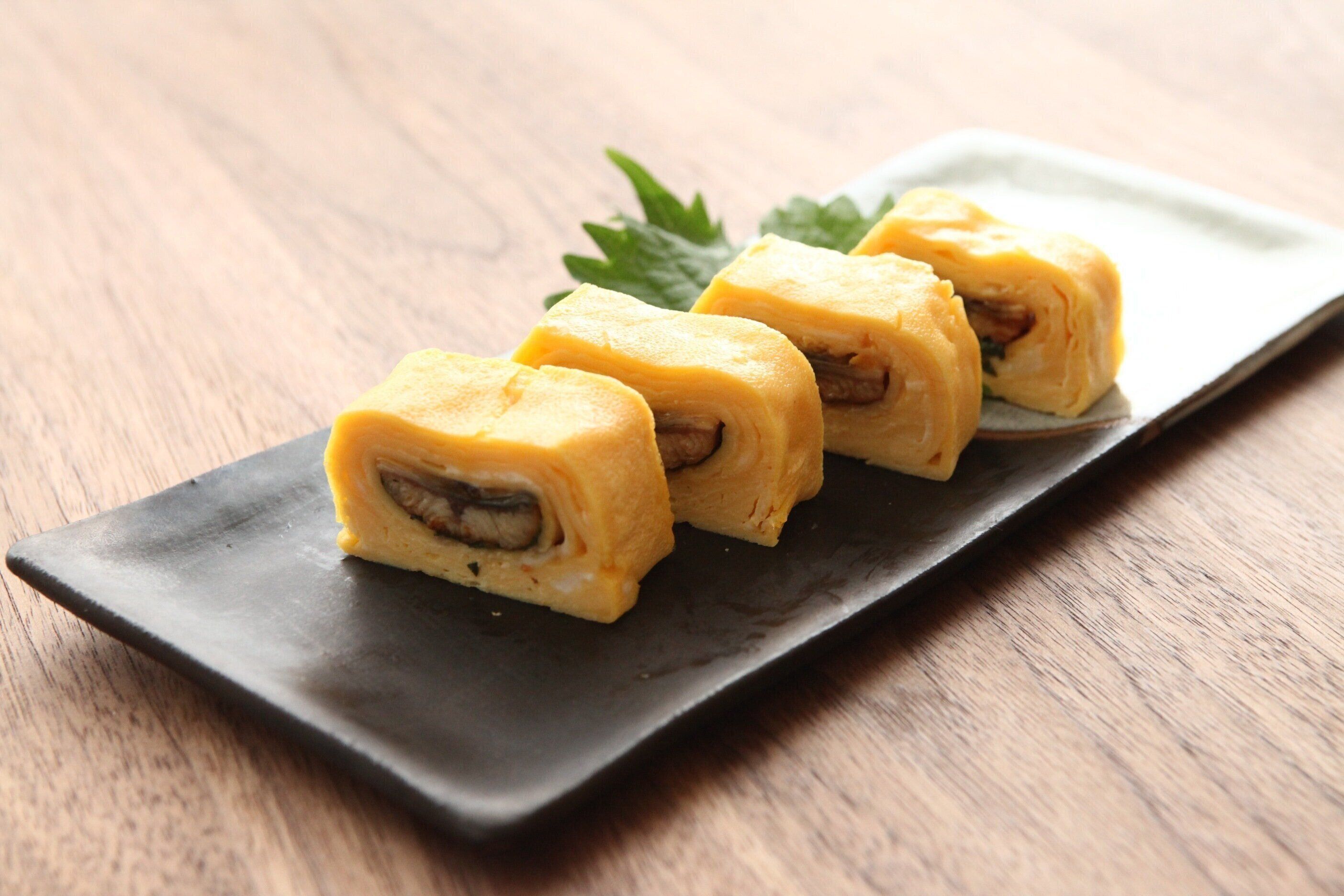 うなぎ料理の定番うまき。うなぎのかば焼き入りでしっかりした味つけですが、いっしょに巻き上げる大葉がさっぱり感をプラスしてくれます。大葉を1枚添えれば、見栄えもぐっとよくなりますね。
