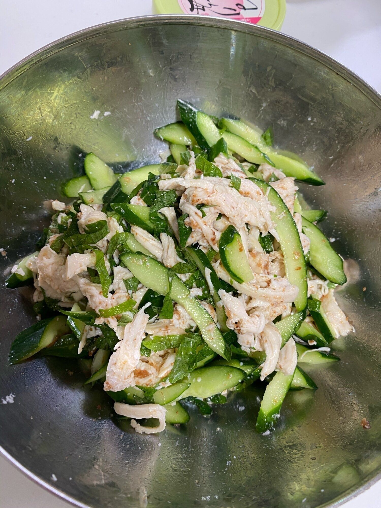ヘルシーでボリューム満点なものが食べたいというときには、こちらのレシピはいかが?大葉と梅の風味豊かなチキンサラダです。ごま油をプラスすると、さらに風味がアップしますよ。