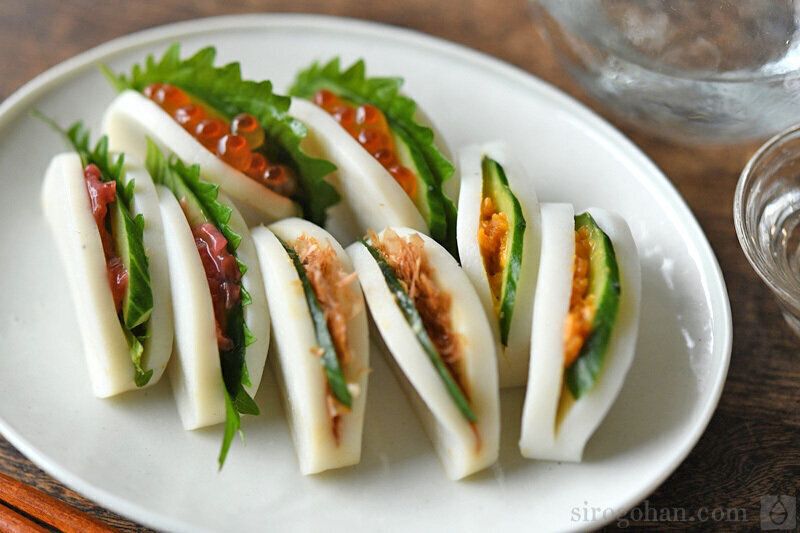 10分以内に完成する、かまぼこのおつまみサンド。切り込みを入れたかまぼこに、大葉やいくらなど、塩気や風味のあるものをはさむだけ!簡単なのに見た目も華やかなので、パーティーにも最適です。