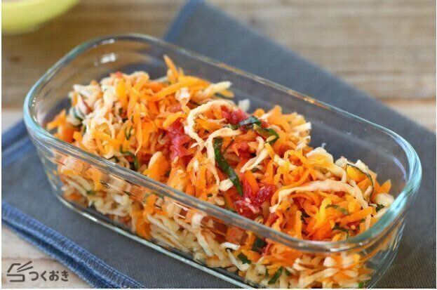 キャベツ、にんじん、きゅうりも入った鮮やかな漬けものレシピ。野菜のシャキッとした食感と、大葉やユズ皮の香りでパクパク食べ進められそうです。最近野菜がたりていないな…といった時にも重宝しそうですね。