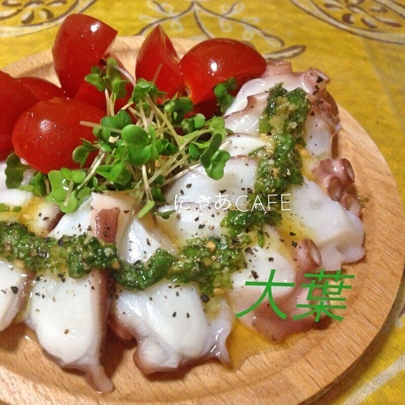 バジルやマツの実がなくても大丈夫!ジェノベーゼのようなソースがかかった、たこのカルパッチョです。大葉をできるだけ細かくきざむことで、よりジェノベーゼに近い仕上がりに。おしゃれなおつまみにもなる一品です。