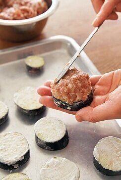 大きめのボウルにひき肉、[A]を入れてよく練り混ぜる。ふんわりとなったら(1)の玉ねぎを加え、(1)のなすの上に等分にのせる。