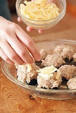 耐熱の皿に(2)の1/2量を間隔を空けて並べる(2回に分けて加熱する)。酒大さじ1をふり、ふんわりとラップを掛けて電子レンジで5~6分加熱する。チーズ60gをのせてもう一度ラップをふんわりと掛け、チーズがとろりとなるまで1分加熱する。