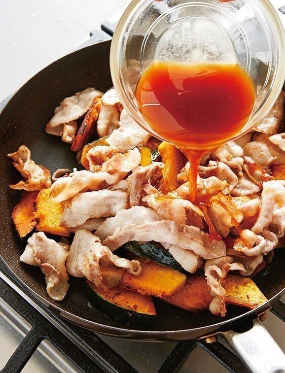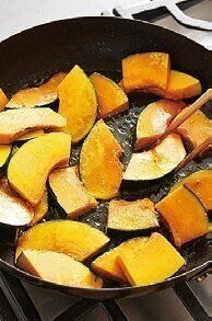 フライパンにサラダ油を中火で熱し、豚肉を広げて並べてから、こんがりした色がつくまで炒めて取り出す。続けてかぼちゃを入れ、両面をこんがり焼く。