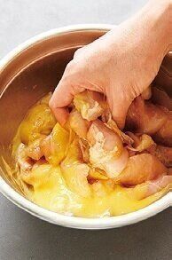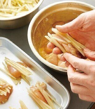 ボウルに卵を溶き、片栗粉を加えて混ぜる。鶏肉を入れてからめる(写真)。鶏肉のまわりにじゃがいもをくっつける。