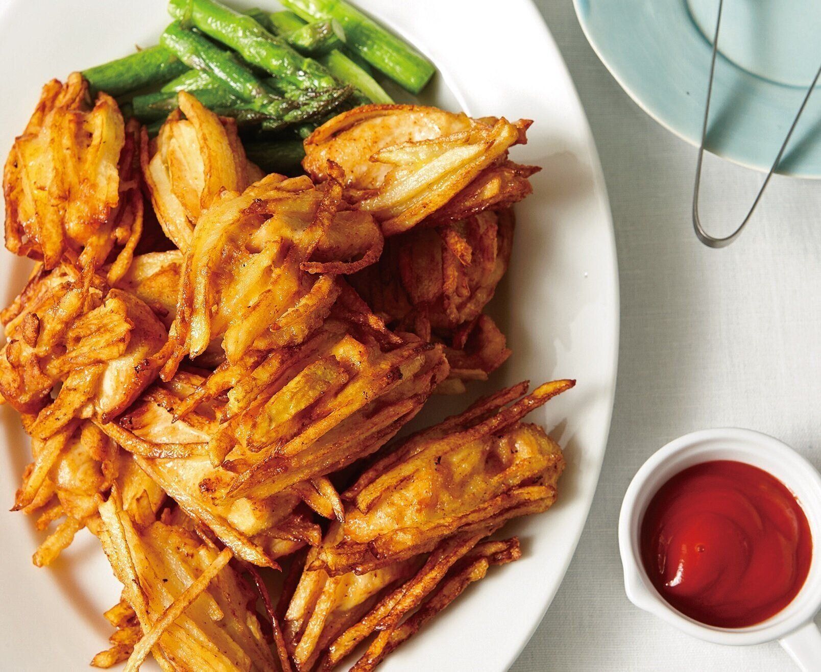 揚げ油を中温(170℃)に熱し、アスパラガスを入れて1分ほど色よく揚げて取り出す。続けて(2)を入れて、時々返しながら4~5分揚げる。こんがりとした色がついたら油をきり、アスパラガスとともに器に盛り、ケチャップを添える。