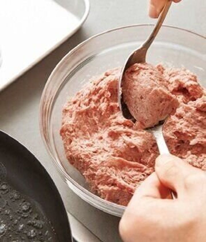 スプーン2本を使って丸めては、フライパンに入れていく。形はいびつでも気にしなくていい。手にたねがくっつかずスピーディ。