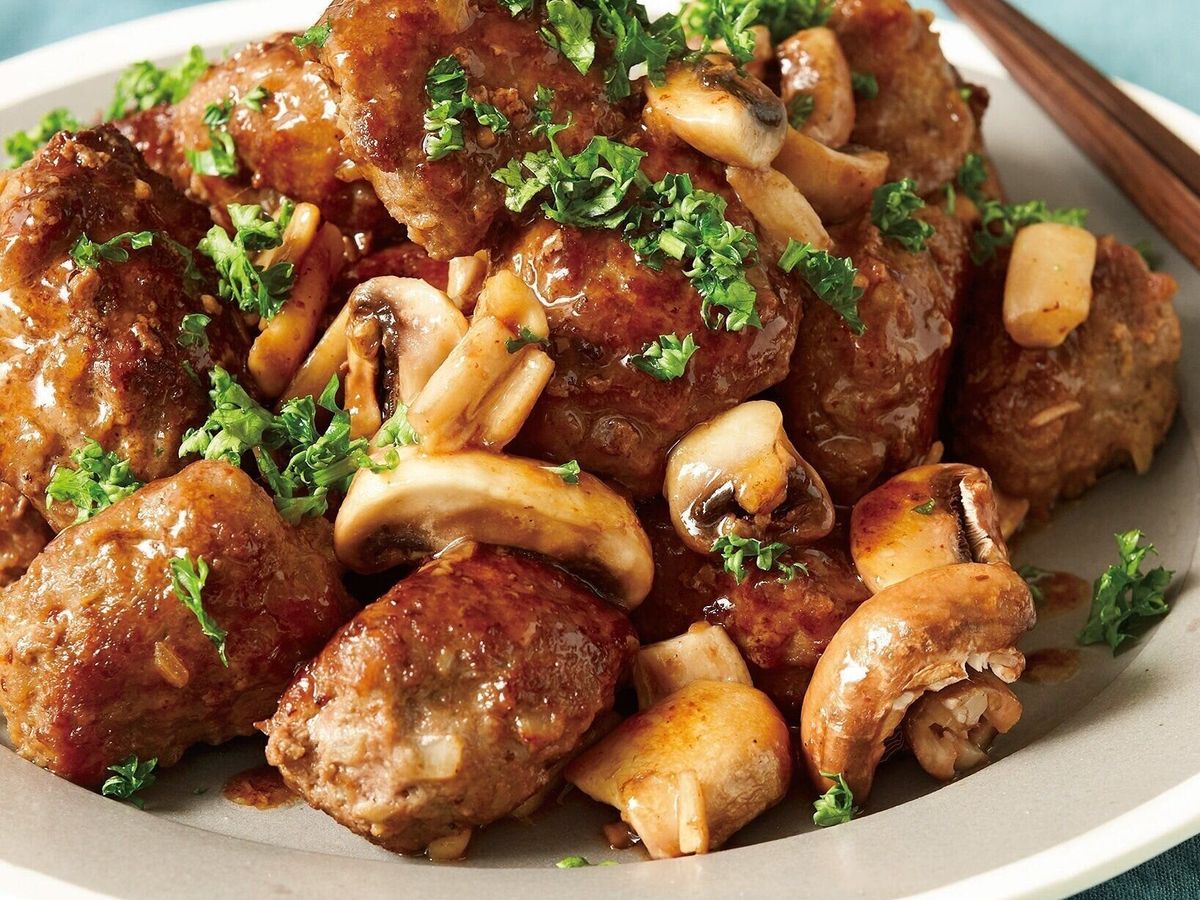 『サンキュ!』2020年6月号の「特売肉&魚で免疫力UPおかず」より一口ハンバーグとマッシュルームのバター照り焼きをご紹介します。