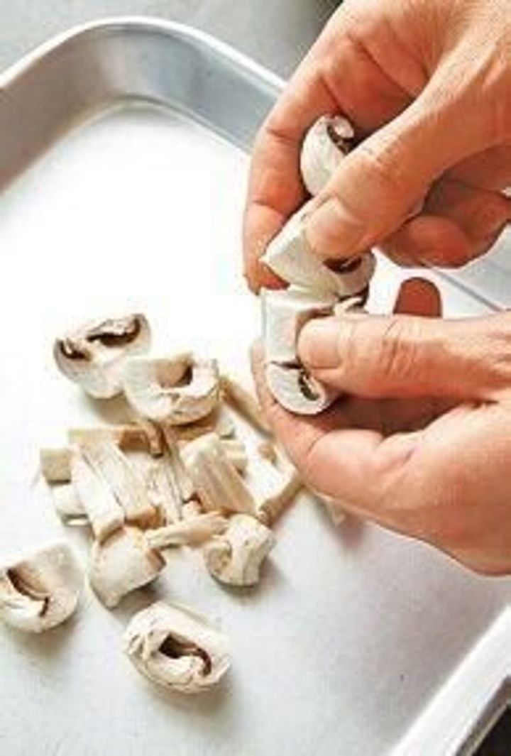 ボウルにハンバーグだねの材料を入れ、手でよく練り混ぜる。マッシュルームは手で割る(写真)。たれの材料は混ぜ合わせる。