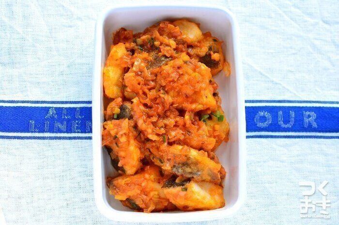 パプリカやズッキーニなど彩り野菜とタラをガーリックで炒めたソテーです。レモン汁の酸味でさわやかさがプラス!パスタにも合う味つけなっており、パスタ弁当としてアレンジができます。