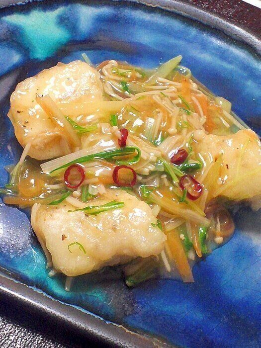 たっぷりの野菜を使ったあんを、カリッと揚げたタラの上にかけた和風のおかずです。おろししょうがは香りを立たせるために、最後に加えるのがポイント!具材はほかにもきのこや根菜類などを使うのもおすすめです。