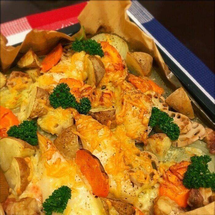 オーブン焼きは肉料理のイメージですが、白身魚もおいしく仕上がりますよ。白身魚はあらかじめフライパンで焼き色がつくまで焼いておくのがポイント。白身魚の旨みが野菜に絡んで絶品です。おもてなしにも喜ばれること間違いなし!