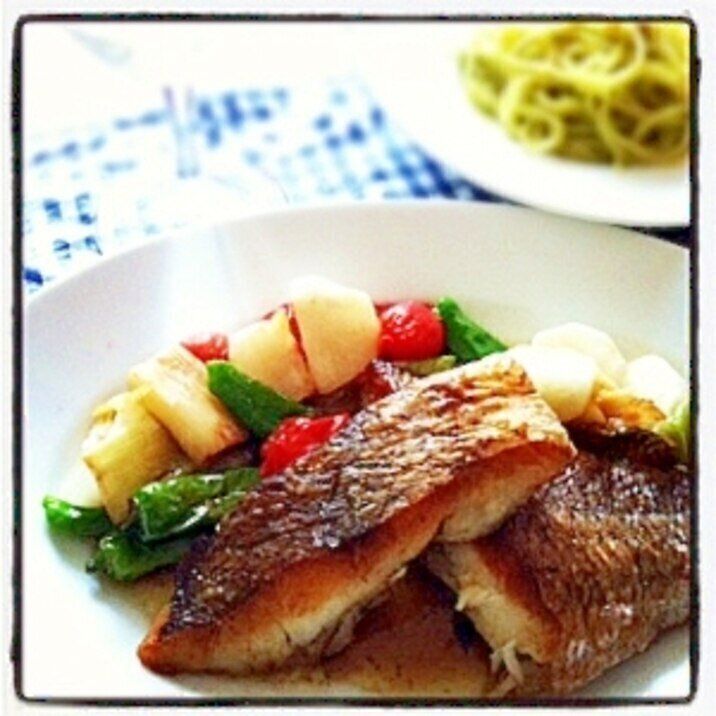 皮をカリッと焼いた鯛と、甘みと旨味のバランスがいいバルサミコソースの組み合わせで食がすすむ白身魚のバルサミコソテー。バターのまろやかな味わいも相性がよく、洋食のメインのおかずにぴったりです!お酒と合わせるのもよいですね。