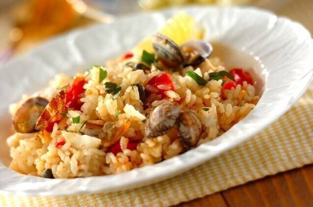 白身魚や、アサリ、ニンニクなど、食材の旨みがギュッと詰まったアクアパッツァライス。トマトやパセリなど彩り豊かで、パーティーメニュー、洋食のメインにもおすすめです。
