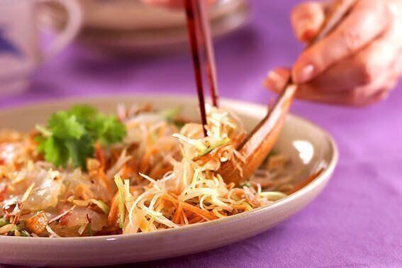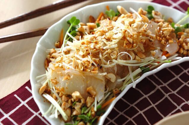 同じく刺身用の白身魚を使ったレシピですが、こちらはナンプラーを使ったエスニック風サラダ。パクチーやナッツが、味と食感のアクセントになっています。たっぷりの千切り野菜と一緒に、よく混ぜて食べるのがポイントです。