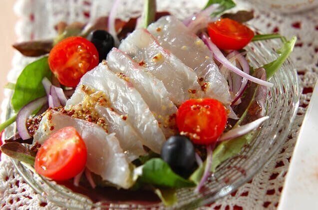 お好みの白身魚で楽しめる、お刺身サラダのレシピです。食材はしっかり冷やしておくのが、おいしく味わうポイント。レモン汁やゴマ油などを使ったドレッシングで、さっぱり味わえそうです。和食の副菜にいかがでしょうか。