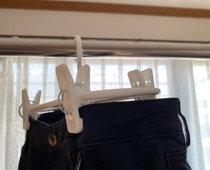 プラスチックで軽いし、洗濯ばさみの部分が大きめではさみやすいので厚手のデニムやチノ素材もしっかり吊るせます。