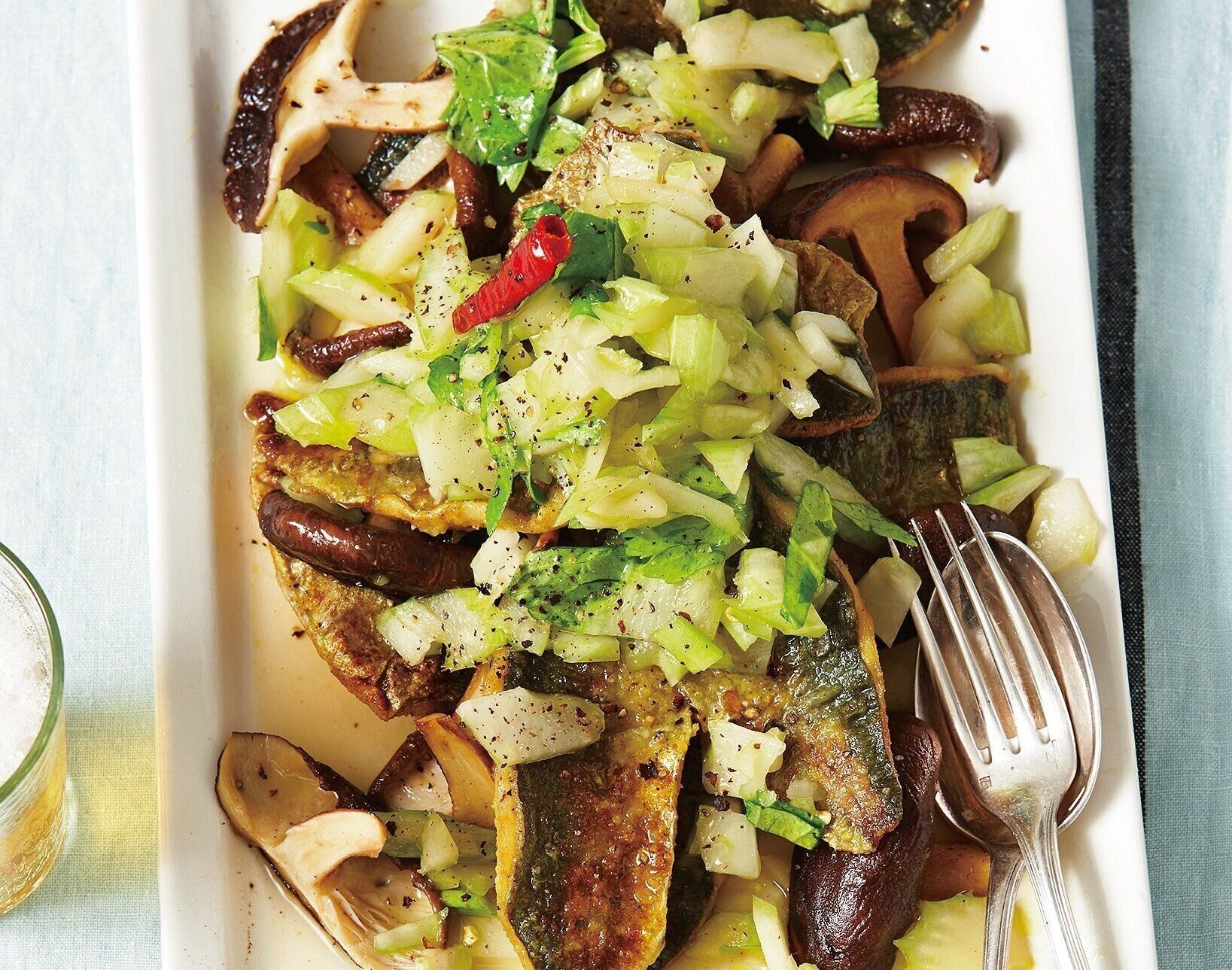 あじは小骨を取り、塩、黒こしょう各少々、カレー粉をふり、小麦粉を薄くまぶす。セロリは粗く刻んで[A]をからめ、塩、こしょう各少々を混ぜ、セロリソースを作る。しいたけは石づきを除き、半分に切る。