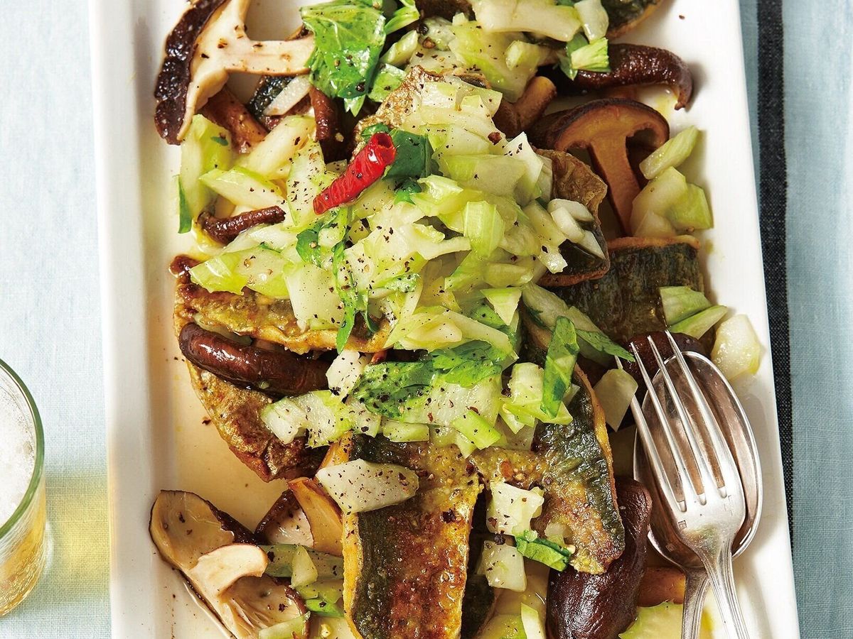 フライパンにオリーブ油大さじ1を中火で熱し、しいたけを入れてこんがりと焼いて、取り出す。続けてオリーブ油大さじ1をたし、あじの両面をこんがりと焼く。