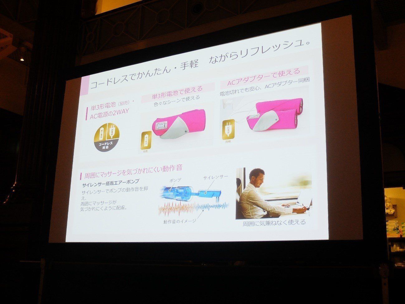 今回は人が集まる体験会という比較的にぎやかな場でありましたが、それでも数十人がいっせいに「レッグリフレ」を使っても、まったくうるささを感じなかったのは驚かされます。