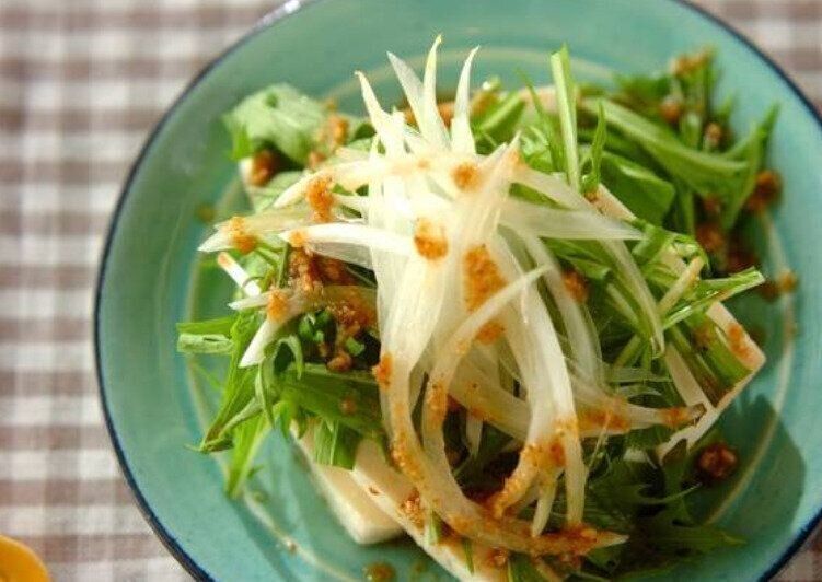 白ごまやごま油を使った、ごまの香りたっぷりのドレッシングでいただく豆腐と水菜のサラダ。玉ネギを加えて風味豊かに、シャキシャキ食感も楽しめます。さっぱりしているので、こってりした料理との相性もばつぐんですよ!