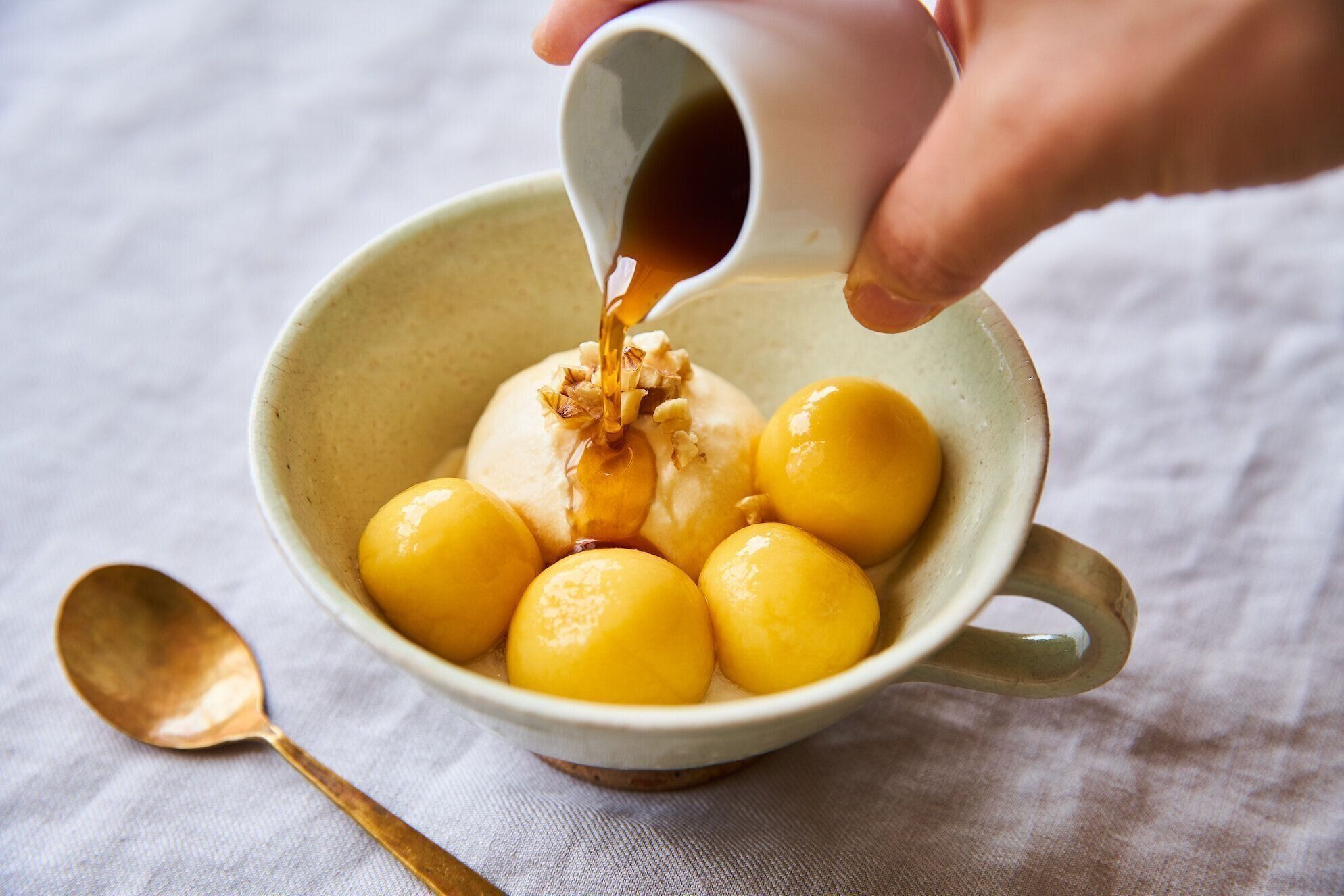 ささっとつくれる手軽なスイーツレシピ、かぼちゃのお豆腐白玉です。バニラアイスとメープルシロップで洋風テイストに仕上げています。かぼちゃに合わせて豆腐の分量は調整してくださいね。