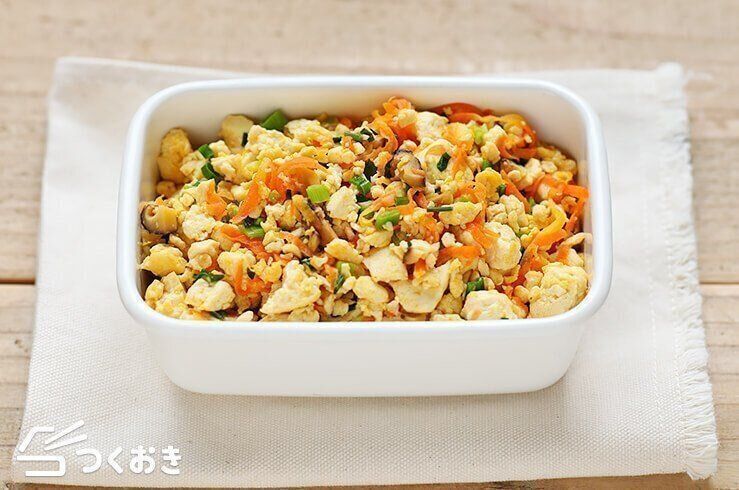 彩りのよい見た目が食欲をそそる、炒り豆腐のレシピです。鶏肉や干し椎茸からいいだしが出て、だしを使わなくても手軽につくれるのがうれしいポイント。鶏肉をちくわに置き換えれば、あっさりとした仕上がりになり、違ったおいしさを楽しめます。