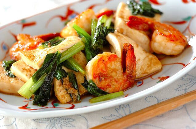 しょうがも効いた中華の炒め物レシピ。エビや小松菜の色味も鮮やかで、メインのおかずにぴったりです。絹ごし豆腐はフライパンで香ばしく焼いて風味豊かに!ほどよいボリューム感もありそうですね。