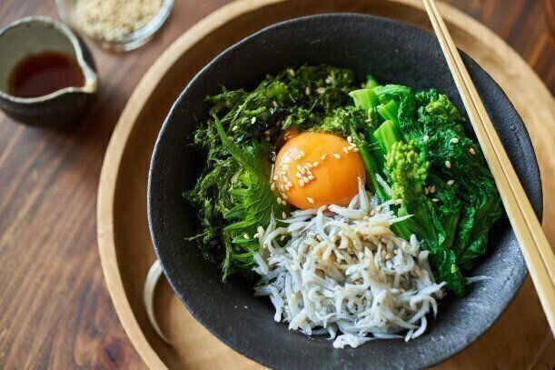 シンプルなしらす丼もおいしいですが、菜の花と海苔をプラスしたしらす丼もオススメです。菜の花の緑としらすの白、卵黄の黄色など、彩りも鮮やかになり見た目も楽しめます。